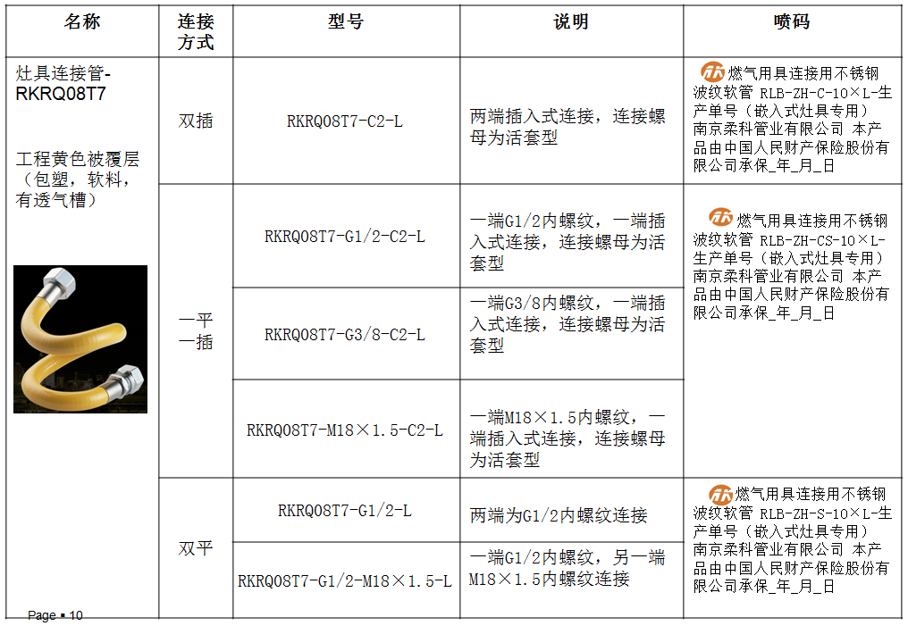 灶具连接管-RKRQ10T6 工程黄色被覆层(包塑,软料,无透气槽)